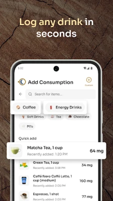 Choose from a built-in database of coffees, teas, and energy drinks, or create custom drinks with your own sizes and mg. Fast logging means better tracking.