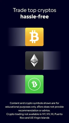 eToro is trusted by millions of users worldwide. Buy top cryptocurrencies like bitcoin and ether without deposit fees. Seamlessly deposit and withdraw to and from your bank account. Note: Crypto trading not available in NY, NV, HI, Puerto Rico and US Virgin Islands.