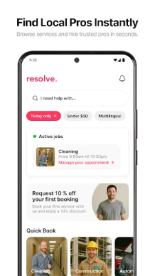 Resolve is the all-in-one app for finding, comparing and booking trusted home-service professionals—in just a few taps. Whether you need a cleaner, handyman, mover, contractor or beauty specialist, Resolve connects you with vetted pros in your area and lets you:
