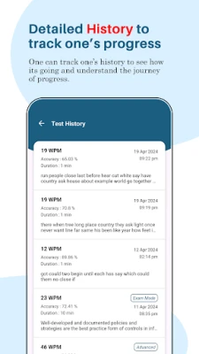 β History Tracking: Keep a detailed record of your typing journey with our built-in history feature. Track every test attempted, monitor your progress over time, and celebrate your milestones along the way.
